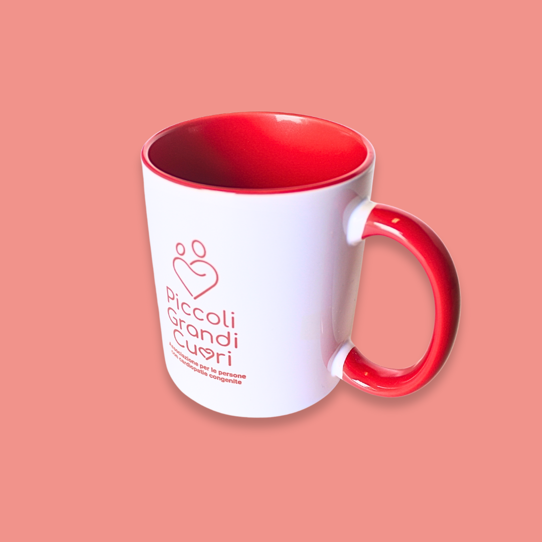 Tazza in ceramica con la capienza di 350 ml di colore bianco fuori e rosso all’interno e sul manico. La tazza è personalizzata con il logo in colore rosso di Piccoli Grandi Cuori.